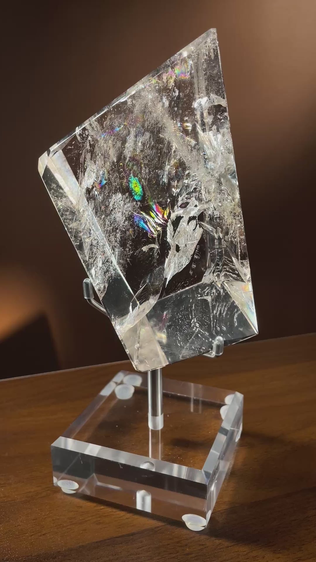 Spectacular Rainbows: The defining feature of this crystal is its breathtaking internal fractures. When light enters the water-clear quartz, it refracts to create massive, brilliant flashes of prismatic rainbows. It is an ever-changing light show from every angle.