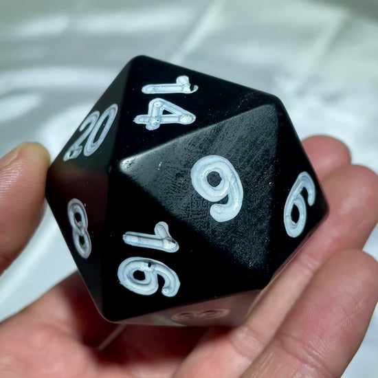 This massive 20-sided die is crafted from genuine Natural Black Obsidian, a naturally occurring volcanic glass formed by the rapid cooling of lava. Weighing in at approximately 0.2kg (0.44 lbs) and measuring 60mm (2.36 inches), this is not just a gaming tool—it is a centerpiece for your collection.