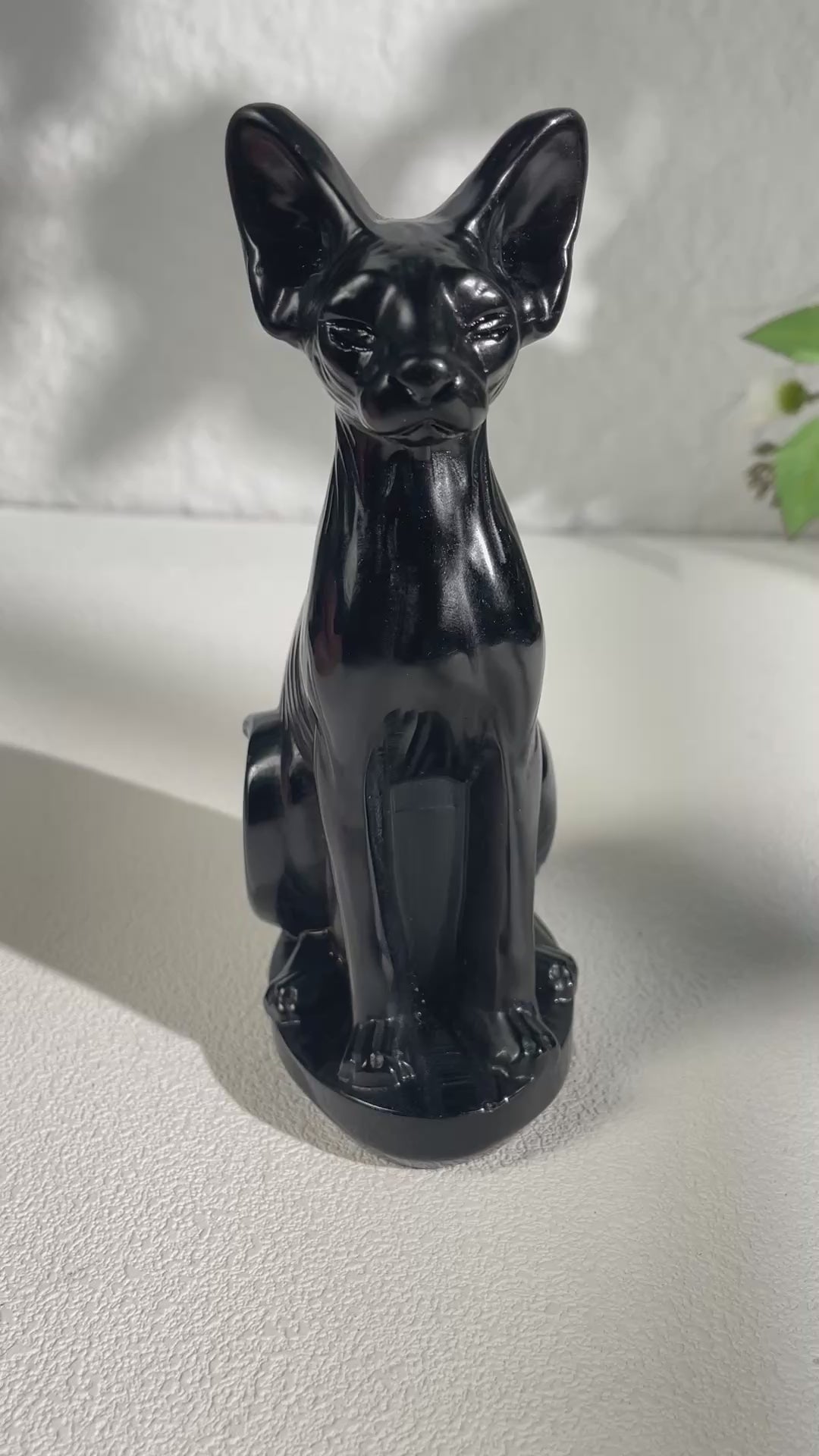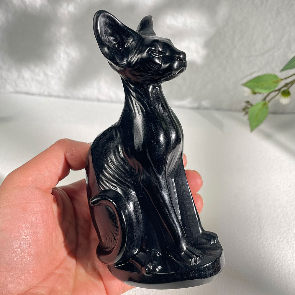 Included in Box: Exact Black Obsidian Sphynx Cat carving.